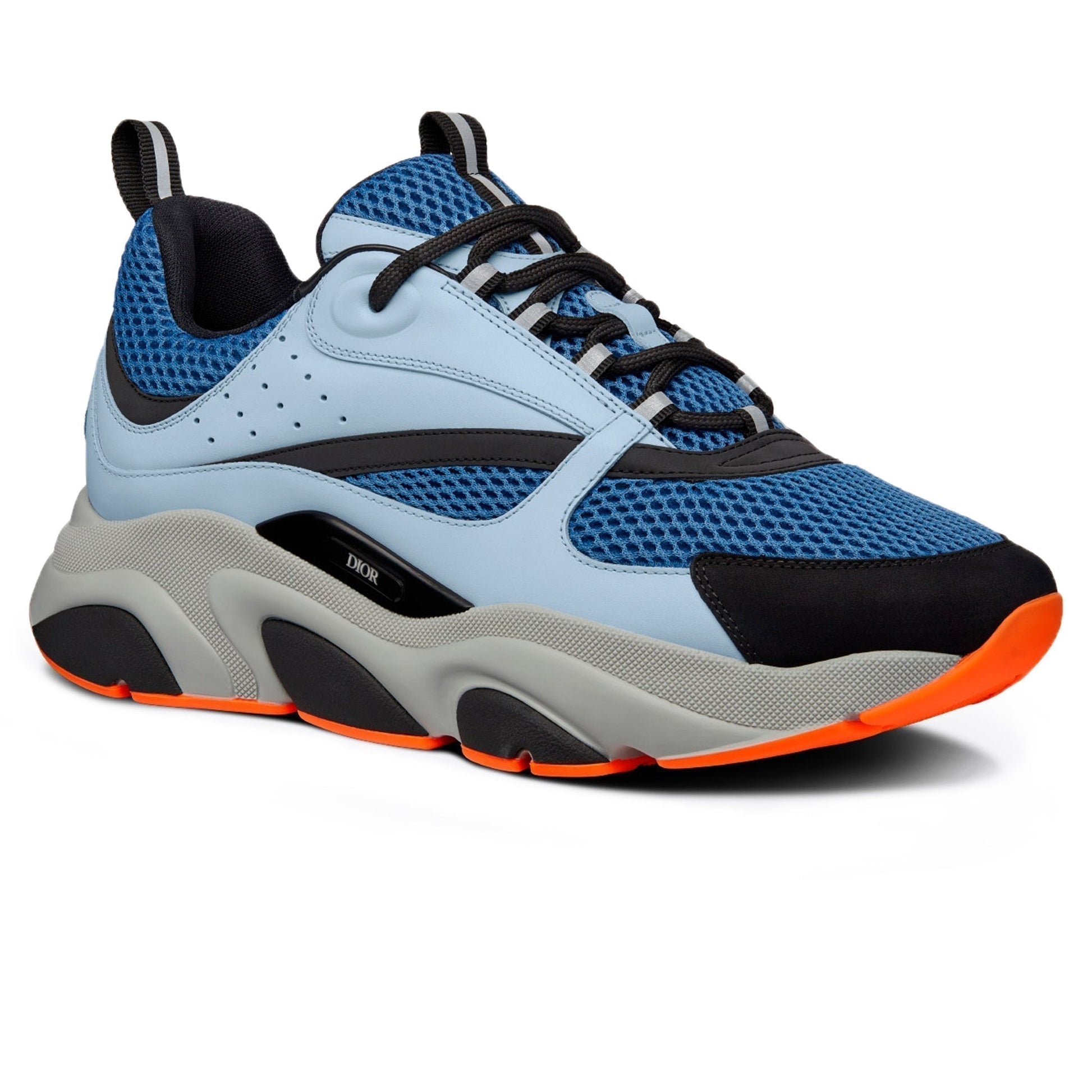 La sneaker B22 réimagine la sneaker chunky à travers une lentille rétro. Combinant différentes matières et textures, dont le veau lisse bleu clair et la maille technique bleue, elle présente une esthétique sportswear audacieuse. Les lacets ronds et la signature "DIOR" en relief sur le côté complètent l'épaisse semelle en caoutchouc sculptée, grise et noire avec des bordures orange. La sneaker se porte avec n'importe quelle pièce décontractée pour une silhouette sportive et contemporaine.